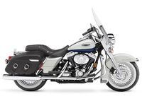 Recalling deep Harley-Davidson roots, the FLHRC Road King Classic rides with nostalgic styling cues like wide whitewall tires on steel laced wheels, a tooled leather touring seat, leather-covered hard-shell saddlebags and metal trim. The Road King Classic is just as ready for the highway with the new Twin Cam 96 engine, 6-speeed Cruise Drive transmission and reduced clutch lever effort. With eye-catching details, the Road King Classic is ready for the road with a large detachable windshield, air-adjustable rear suspension, auxiliary passing lights, triple-disc brakes, electronic fuel injection and cruise control. Offered in four solid colors and six two-tone color combinations, plus three two-tone custom color options for 2007.