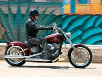 Two versions are offered: the standard Rocker ($17,295), equipped with a solo seat and satin-stainless metallic finish covering all the hard parts, and the blingalicious Rocker C ($19,495) that substitutes chrome for the satin, adds tastier Ghost Flame paint options and the trick two-in-one convertible seat that morphs from solo to two-up without tools in just seconds. The styling cues on both models come straight outta Sturgis, with a kicked-out front end (rake is 36.5 degrees) and an extended, 49mm fork pinching a tall, skinny, 19-inch front wheel. At the other end you'll find an extra-wide 240mm rear tire tucked under the unique Rockertail strutless rear fender, mounted directly to the swingarm to give the illusion of a rigid rear end, just like those cool choppers you see on TV. Of course this is still a Softail, so there's 3.4 inches of rear-wheel travel from the shock mounted beneath the engine, in a configuration that allows the lowest seat height in the class: 24.5 inches.