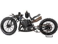 Steampunk meets supercross in Lebanese-born, Texas-based Rafik Kaissi's "Spring Frame." Powered by a 450cc Yamaha motocross motor set atop a minimalist mainframe that doubles as a leaf spring rear suspension, the RK Concepts machine is one of the most bizarre bikes we've ever seen. The fork is also leafspring suspended, and the finned fuel tank and fold-up tractor saddle deliver a decidedly turn-of-the-last-century look.