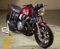 My favorite thing is to get the ugliest bike out there and try to make it look neat. And that CB looks terrible from the factory! The OVER Racing swingarm I used here, and all the carbon fiber, all that came from the Japanese aftermarket, and it was really hard to locate. The handmade, limited-edition Yoshimura pipe is sourced from Japan, too. I hate the way it sounds—it's so quiet—so I'm going to cut it up and rebuild it with a high-mount Racefit can.