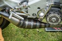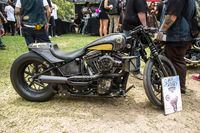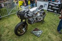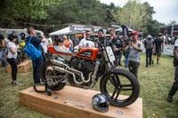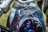 Twenty-five invited builders each brought a custom creation, as did hundreds of other fabricators. Engines range from Harley, Honda, Indian, Triumph, BSA and other manufacturers, with a strong lean towards vintage models. Custom welded frames and fabricated details and bodywork are king, featuring materials like carbon fiber, bronze, Lucite, and wood. One bike featured insects incorporated into its shifter and tank, while another sported a real fur racing “stripe” stretching from tank to tail. Finishes varied from brushed (or machined) metal to glittery rainbow striped paint to chrome etched in filigree.