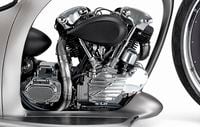 Built to highlight the Slovenia-based exhaust manufacturer's expanding line of American V-twin products, this radical custom created by Slovenian workshop Dreamachine Motorcycles is a futuristic take on a classic art deco shape, with voluptuous bodywork, a massive, aluminum-and-carbon 30-inch front wheel, and virtually no visible controls or cables for a clean, otherworldly look. Powered by an S&S-built Knucklehead replica motor with a one-off Akrapovic exhaust system that is seamlessly incorporated into built-from-sheet bodywork, it's a striking statement that will draw attention to the Akrapovic brand at custom bike shows around the world over the coming year.