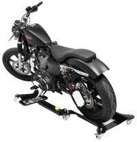 Measuring 65-inch total length and able to handle 1,100-pound capacity, the adjustable motorcycle dolly is more stable than full-length dollies and features high-quality wheels and bearings for easier movement. It takes up less space than other dollies when not in use and is made from 8 mm heavy-duty, laser-cut plate steel. The kickstand arm adjusts to fit most motorcycles where the center of the rear wheel to kickstand measures 34-50 inches. It also has two aluminum diamond plates to protect and ensure the dolly stays in great shape.