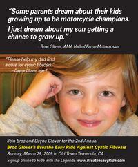The 2009 edition of Broc Glover's Breathe Easy Ride Against Cystic Fibrosis (BER) takes place from 10am-4pm on Sunday, March 29, 2009 in Temecula's Old Town California Row. AMA Hall of Fame announcer Larry "Supermouth" Huffman will kick things off at 10am with pre-ride festivities including rider check-in and registration, raffles, autograph and photo ops, interviews with the Legends, food and fun. Attendees, both rider and non-rider alike, are encouraged to bring their cameras (don't forget fresh batteries and empty digital media cards!).