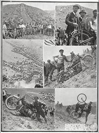 1-The Entrants in the Free-For-All, and Capistrano Hill in the Background. 2-Carl Goudy (left), Fred Hoffer (right), Sam Hamilton and the Tractor Band on Hamilton’s Machine. 3-A Part of the Automobile Crowd. 4- Floyd Clymer and His Stalled “X.” 5-This is Geo. Rubsch. He Stopped Here. 6-“Dud” Perkins and His Bucking Harley-Davidson