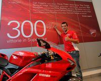 Passing the historic milestone of 300 World Superbike race victories for Ducati was an honour taken by Checa onboard his Ducati 1198 in race one of the Silverstone round of the series in July, a victory that he dedicated to Ducati by autographing the celebratory graphic that currently welcomes visitors to the main reception area of the Bologna factory. Ducati management officially thanked Checa for his incredible achievements so far this season before celebrations continued with the staff of Ducati Corse in the race department of the company.