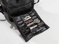 This backpack also proved its moto-centric design with a zippered exterior tool pocket, but lost a point due to its lack of reflective materials. When I stopped to fuel up, I removed the Moto Barrage to get my wallet. I set the pack on the ground and it remained upright on its own—nice. A snug place to hold my laptop was another plus, as were the zippered pockets on the outside of the roll-top that I used to store smaller items.