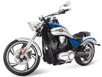 On the performance front, all Victory motorcycles-even the value-priced Vegas and Kingpin-now utilize the Freedom 106 V-twin motor and six-speed overdrive transmission. The 100 cubic-inch/five-speed combination has officially been discontinued. The Cross Roads, Cross Country and Vision touring machines use a Stage 1 version said to make 92 horsepower and 109 lb.-ft. of torque, while the Hammer, Jackpot, Kingpin and Vegas share a Stage 2 version with hotter cams to deliver a claimed 97 bhp and 113 lb.-ft. of torque. All models get redesigned mufflers with larger outlets to create a lower tone and more appealing sound-addressing another frequent criticism of Victory's machines.