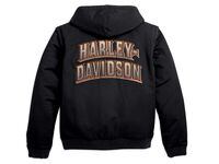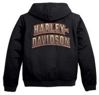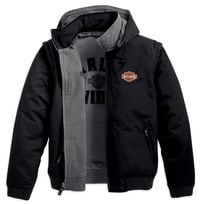 Reversibility, zip-off sleeves and a snap-hood translate into 12 wearable combinations for the new men's Bold 12-in-1 Reversible Jacket (P/N 97527-10VM, $195) from the Harley-Davidson(r) MotorClothes(r) Spring 2010 line. Its black side is constructed from water-resistant 78-percent cotton/22-percent nylon, while the grey side is 100-percent cotton canvas. Zippered hand-warmer pockets and embroidered graphics on both sides are matched by Rib-knit cuffs and waist. Available in S-5XL and Tall sizes.