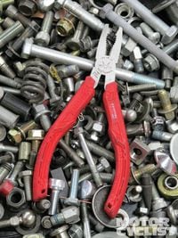 That capability is due to the VamPLIERS’ curved jaw tips with horizontal and vertical serrations. These let the VamPLIERS securely grasp stuff that normal pliers or Vise Grips would simply slip off of. Inboard of the VamPLIERS’ specialized jaw tips are deeply serrated concave clamping surfaces ideal for holding larger items. And further inboard are wire-cutting blades, which I’ve used to cleanly sever stuff as robust as steel throttle and speedometer cables. The VamPLIERS have replaced everything except my needle-nose pliers, circlip pliers, and wire strippers. Add a pair to your toolbox and you’ll be amazed how often you reach for them.