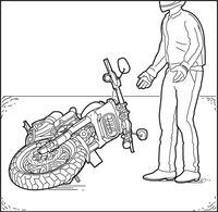 Whether it's from a kickstand sinking into soft earth or just a loss of balance, sometimes your beloved ride ends up on its side. Before you pick it back up, take a beat to make sure the key and the petcock are switched off, then survey the scene. The damage is done to the bike (and your ego), so take your time with these steps.