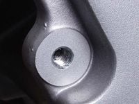 If the damage isn't severe, and only the first few threads are crossed (1), the repair will be fairly easy. Reach for your handy-dandy tap-and-die kit and confirm the size and thread pitch of the fastener. Most tap kits come with a thread gauge (2); use this to verify which tap you'll be using. This is an 8mm thread with a 1.25mm thread pitch--meaning the fastener penetrates 1.25mm for every turn.
