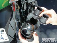 The unrestricted exhausts registered 90.1 dBA at idle and 107.2 dBA at 5000 rpm—freeway speed. With the P1X Powertip (_www.twobros.com_; $34.98 each) we sacrificed 2.7 bhp but also knocked the dB levels back considerably—to 84.5 at idle and 102.7 at 5000 rpm. A 5 dBA drop goes a long way and required only the removal of each end cap to install. The less-restrictive (larger inner diameter) P1 Powertip ($29.98 each) cut the sound levels back to 86.6 and 104.5 dBA, respectively, while actually gaining 1.3 bhp at peak compared to the tip-less exhaust. I'm quite happy with the ZX-14R's soft growl with the P1X Powertips installed, and honestly haven't even noticed the three ponies I had to sacrifice. Maturity isn't so bad after all.