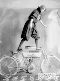 We've got women cops, firepersons, astronauts and rodeo clowns, but somehow there's a disturbing shortage of talented women racers. We need a few more like the lovely Latelle, stuntress from a century ago, brought back to life here courtesy of the Tod Rafferty photo archive. Latelle looks like a daring young lady who certainly knows her way around an Emblem. At least she did a hundred years ago. Bet she's considerably less frisky now.