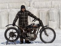 I’ve known the organizer of Milwaukee’s Mama Tried motorcycle show for a long time. He invited me to bring a bike this year, and when I saw the photos of guys ice racing after last year’s show, I knew I had to try it on the cut-down. I bought some screws, watched a YouTube video, and built some tires. That’s not as easy as it looks! The last few laps it was getting pretty loose—half the screws were missing from the front tire. I’ll be back on the same bike next year, with better tires!