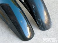 Plastic Renew does just what its name suggests, and works on any dyed plastic parts, whether they're on a modern dirtbike or an older streetbike. The box contains several sheets of 220, 300 and 400-grit sandpaper, a ball of steel wool, a bottle of the all-important Plastic Renew chemical, and a durable paper towel for applying the stuff. The process starts with the rough 220-grit paper, which you use to sand out deep scratches and remove the crust of faded, oxidized material. From there you move up to the wetted 300- and 400-grit sheets to smooth the finish and buff out any remaining marks. It sounds like a lot of work, but we're talking about plastic here, so the job goes relatively quickly. Once the piece is sanded smooth you brush on the Plastic Renew chemical, which PC Racing describes as a flexible clear coat; it's what puts the shine back in the plastic and keeps it protected. The steel wool is then used to buff the clear coat, after which you apply a final coat or two of the Plastic Renew juice.