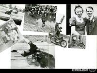 Left page-From top to bottom-An unusual hillclimb shot caught by a wandering Wisconsin photographer. Anybody can loop ‘em, but it takes practice to stand one on ‘er nose “Frenchie” on 26 leads “Woodsie” on 9, during the final race at Trenton, N.J., on August 16th The electric eye timer used at the Trenton races. Neat but not gaudy, you might say You guessed it. Putt Mossman “comes a cropper” on an English track. Too much tea Putt, you need more black coffee and raw beefsteak Right page-Cordy and Marie after their marriage in England. Fred Whitehead of Hackney Wick staged a reception. Speedway News reports that the bride and groom marched into the club to the strains of the Wedding March, whereupon the gathering became “matey over cocktails, much matier over the wine and so matey over Champagne that one Tom Bradbury Pratt nearly offered free admission to all fans for the balance of the season.” My Word! Well, upon occasion Cordy can do a good job of this matey business himself Emil Recke and Carbino of New Yor