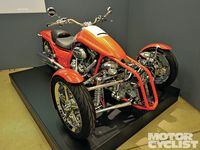 Other intriguing prototypes that never saw production include the '75 V-1100, an OHC version of the venerable Sportster platform with the "tank" forming the airbox and the fuel carried under the seat. There's also an experimental, liquid-cooled Harley/Aermacchi MX-250 motocrosser with the radiator mounted behind the front numberplate and coolant hoses run through the frame. Collection X showcases rare showbikes, a three-wheeled, Evo-powered, side-by-side roadster that might have been an updated version of the Trihawk, the 265-mph Harley-Davidson streamliner made famous by Cal Rayborn in On Any Sunday, and much more.