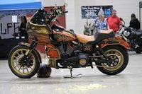 Top honors in the invitational bike show went to Seth and Casey Neefus of Red Clouds Collective for their custom 1957 Triumph Tiger T110 called “Green Dream.” The pre-unit motorcycle is the result of eight months of fabricating and customizing by the Neefus brothers, who built it for Born-Free 2023 as one of the invited builders. Mike Aldridge won the award for Top Twin Cam with his 2001 Harley Low Rider called “Darla the Dyna.” Aldridge named the motorcycle after his Mom, who taught him how to ride and her ashes are in the frame of his daily rider. The “McShovel,” featuring a twisted Ronald McDonald paint job on the tank, a wicked redheaded Ronald suicide shifter, and an air cleaner shaped like large fries, was also a fan favorite.