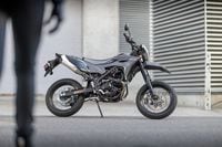 Braking is handled by a 300mm semi-floating petal disc and twin-piston caliper at the front along with a single-piston, 220mm disc setup at the rear. The bike is styled to be a spitting image of its older sibling, the KLX300SM, and rolls on 17-inch wheels front and rear.