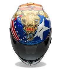 The helmet features a red, white and blue flag motif on the front with both the American and State of Texas flags, which wraps around the rear to merge with a hardwood design reminiscent of the floorboards in a Western saloon. The helmet is crowned with a Longhorn cattle skull, giving it a colorful and imposing appearance. The specially designed helmet also features a horseshoe, the COTA logo and the event logo representing the upcoming 2014 Red Bull MotoGP of the Americas.