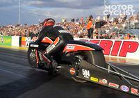 Three-time Pro Stock Motorcycle World Champion Andrew Hines, who entered Las Vegas with a 25-point advantage over his Screamin’ Eagle Vance & Hines Harley-Davidson teammate Eddie Krawiec, raced to the win with a 6.965 at 191.02, defeating reigning world champ Matt Smith on the NitroFish Buell. Hines claimed his sixth victory of the season and expanded his lead in his bid for a fourth championship to 92 points.