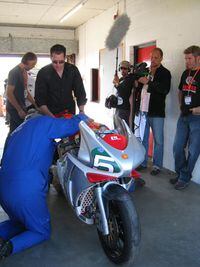 [The top two Pro-class entrants, both the AGNI and XXL teams, relied on an existing streetbike chassis (a late-model GSX-R600 for AGNI, and a late nineties Laverda Formula for XXL), compared to the Mission and MotoCzysz machines that were purpose-built from the ground-up. The third-place Brammo machines were highly modified versions of that company’s existing Inertia production bikes. Given the speeds that these machines were navigating the course at, however, chassis technology was not a limiting factor, nor was rider skill. The limiting factor at this point appears to be available battery and electric engine technology. The MotoCzysz, which reportedly produces 150 lbs.-ft. of torque, simply melted its (three) motors. Others teams that chose a lower-power, lighter-weight strategy to get them over the mountain suffered different problems, running out of juice crossing Snaefell Mountain. The lighter-weight, moderately powerful Brammo split the difference, with mixed results. One of Brammo’s two bikes suffered motor failure 11 miles in at Cronk-y-Voddy. The other machine finished in the last spot on the podium but just barely, eating its motor in the process too.