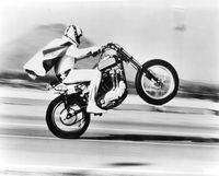 I didn't quite buy the whole King of the Daredevils shtick then. I still don't. Robert Craig Evel Knievel Junior was born on October 17, 1938. He died in November of 07 and I'll miss him. Nobody has ever gone farther on pure diamond-studded 24-karat chutzpah and a Harley-Davidson XR750. He was a walking…okay, limping, trash-talking superhero who could pull longer wheelies than "Oh Boy" Bob on the immortal Kawasaki F21M. If intestinal fortitude were legal tender, the man could've bought Bill Gates. I still didn't get it. Unlike the other figments of our imaginations, Evel got hurt.