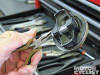 Like hammers, pliers are much maligned as motorcycle repair tools. The problem isn’t the pliers themselves; it’s folks using them as a wrench. Pliers are guaranteed to round off nuts and bolts, but they are excellent tools to have on hand for the work for which they are intended. I have some favorites that I don’t like to be without. I have a set of three precision mini-pliers: a needle nose, a long nose and a wire-cutter. The long-nose pliers see use all the time, and are priceless when installing piston circlips. Cheap pliers have jaws that don’t match perfectly, and serrations which quickly wear smooth. Spend the money for good ones. I also have a medium side-cutter with a square nose. My favorites come in KTM toolkits; I haven’t found the same thing from any tool outlet. I also use the heck out of long-reach pliers with a 45-degree bend near the tip. Mine were a gift, and I feel dumb for not buying my own a long time ago. I also have a set of quality snap-ring pliers. Again, cheap ones are useless; good ones are priceless. I don’t use them often, but water-pump pliers can be very handy. Factory mechanics swear by the Knipex brand, but I like a standard serrated jaw for the work I do.