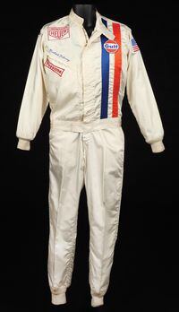 When principle filming of Le Mans was completed, Solar Productions donated this suit to the British newspaper, The Observer for a special Le Mans-themed contest in 1971. By answering 3 Le Mans history questions correctly 12 year old Timothy Davies of Wolverhampton, England was chosen as the winner and presented with the suit by racing driver Richard "Dickie" Attwood, winner of the 1970 Le Mans race and driver of the Porsche 917K Gulf car during driving sequences in the film. Filmed on location in Le Mans, France, the film's spellbinding cinematography provides a thrilling glimpse of the sights and sounds of Porsche 917s and Ferrari 512s, locked in fierce competition for outright victory. It featured footage from the actual 1970 24 Hours of Le Mans race and remains popular with racing enthusiasts today as it accurately depicted the era with lots of racing and minimal dialogue. The film featured numerous top-level racing drivers of the day for the driving sequences including Derek Bell, Vic Elford, Jacky Ickx, Brian Redman, Jo Siffert and many others. The suit is in excellent condition and without question, one of the pinnacles of motorsport memorabilia and the Holy Grail of racing film costumes. The suit has a presale estimate of $200,000-$300,000. Image of Steve McQueen in Le Mans© Solar Productions 1971