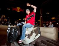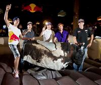 Andrew Short (USA), Marvin Musquin (France), Max Nagl (Germany), Ben Townley (New Zealand), Jonathan Barragan (Spain), Rui Goncalves (Portugal), Tanel Leok (Estonia) and birthday boy,Tony Cairoli (Italy), got a taste of Western culture, challenging "Widow Maker," the bar's mechanical bull. In the spirit of not injuring any of them on the eve of the international competition, Widow Maker was more like Ferdinand the peaceful bull, but regardless still managed to buck the riders off in impressive fashion. Note Cairoli's graceful "off" in the attached photo.
