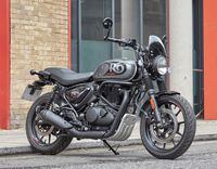 A more modern, nontraditional take on the same 350 platform that is used with the Classic and Meteor 350, the Hunter 350 has the sound, feel, and character you expect from a Royal Enfield single, but with a lighter, more nimble chassis design that feels more advanced and refined than the Classic or the Meteor. Besides the styling that revolves more around contemporary roadsters, the Hunter features subtle changes to steering geometry that result in a more dynamic-feeling motorcycle. A steeper rake and shorter trail contribute to a shorter wheelbase than the previous 350 models, and 17-inch cast aluminum wheels front and rear help with quick steering while also allowing the Hunter access to some of the best aftermarket on-road rubber available. The Hunter is 21 pounds lighter than the Meteor and 30 pounds lighter than the Classic, but that feeling of weight reduction is amplified by the chassis changes.