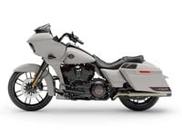 The new CVO Road Glide, available in any color as long as it’s Premium Sand Dune (a sort of satiny eggshell with a pearl topcoat), stands out against its darker-hued stablemates and goes by Harley’s lettering nomenclature as FLTRXSE. It also cuts a unique niche for itself, not being a massive touring bike (Limited), three-wheeler (Tri Glide), or more conventional bagger (Street Glide, whose fork-mounted fairing and less streamlined bodywork conveys more nostalgia than sleekness).