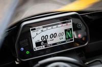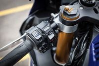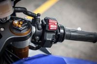 As we described in our First Ride, all of the electronics are controlled from two bar-mounted switches and displayed on a color LCD screen. On the left grip, a simple up/down/enter switch familiar from R1s of yore, while the right grip uses a thumb-operated wheel that clicks to select. The click-wheel is used to navigate all of the internal menus, while the three-way switch on the left grip adjusts ride modes on the fly (it also engages launch control).