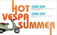Now through September 15, 2010, the _Hot Vespa Summer _campaign makes it easier for customers to ride into fall on a Vespa, offering a $500 discount off the stated MSRP for use when purchasing a new and unused 2008, 2009 or 2010 carbureted Vespa S 150, Vespa LX 150 or Vespa LXV 150 scooter from participating dealerships. Additionally, customers purchasing a 2008, 2009 or 2010 two-valve engine LX 50 will receive a $400 discount off the stated MSRP from participating dealerships.